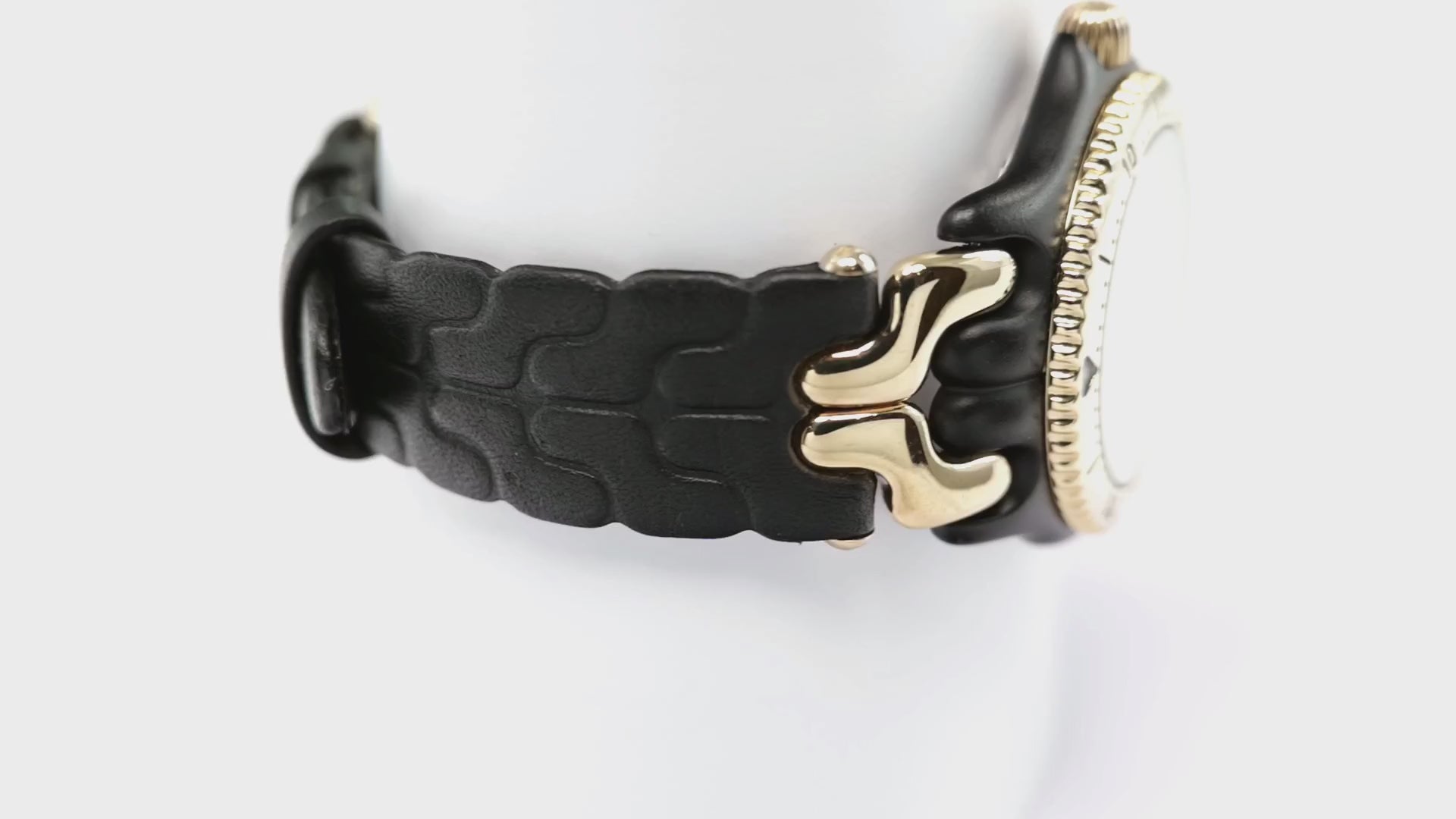 • TAG Heuer black genuine leather strap with S link pattern and starting 18k gold plated links - minimal signs of wear, cleaned